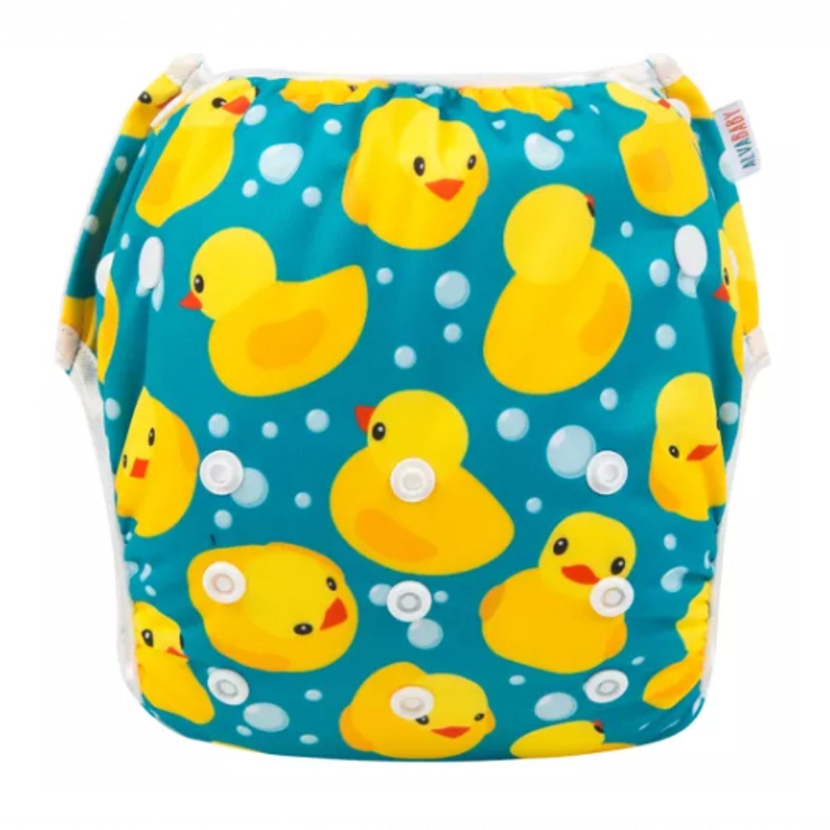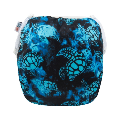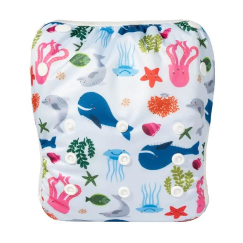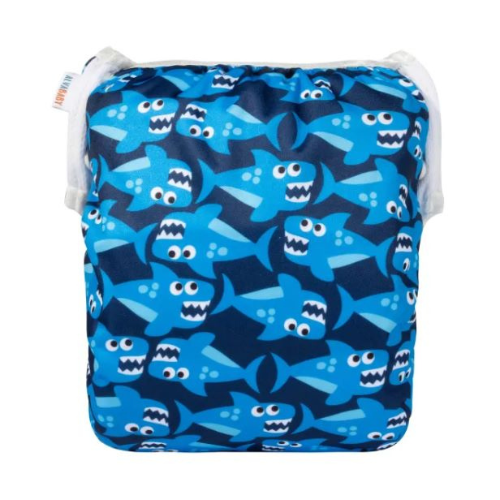 Pañales para el agua de Tela que se lavan y se vuelven a usar. Estos pañales para el agua funcionan igual que los descartables, solo retienen sólidos, el líquido se pasa. La razón es que si tuvieran absorbente, quedaría enchumbado con el agua de la piscina/playa antes de que el bebe haga pis.